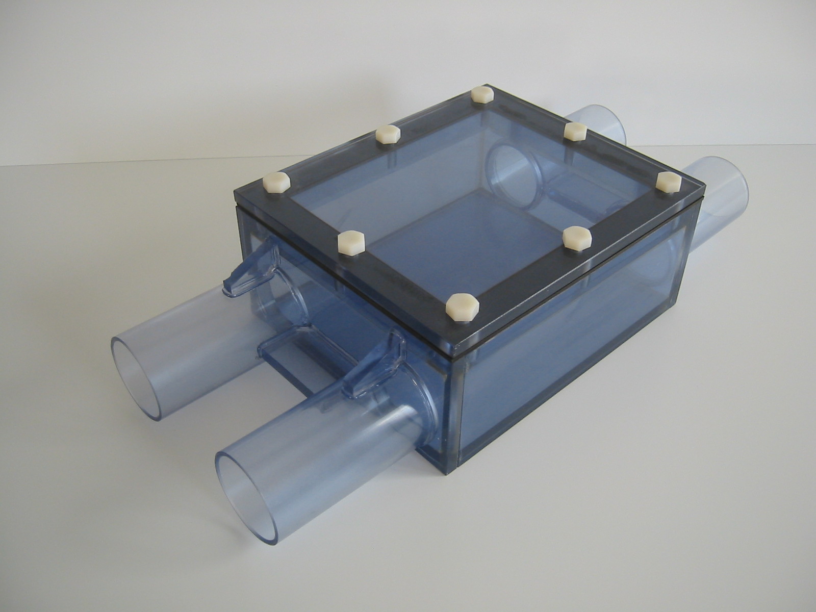 Kupplungsbox für Reinraum Sicherheitsleitungen. Klebe und Schweißkonstruktion aus 10mm PVC transparent.